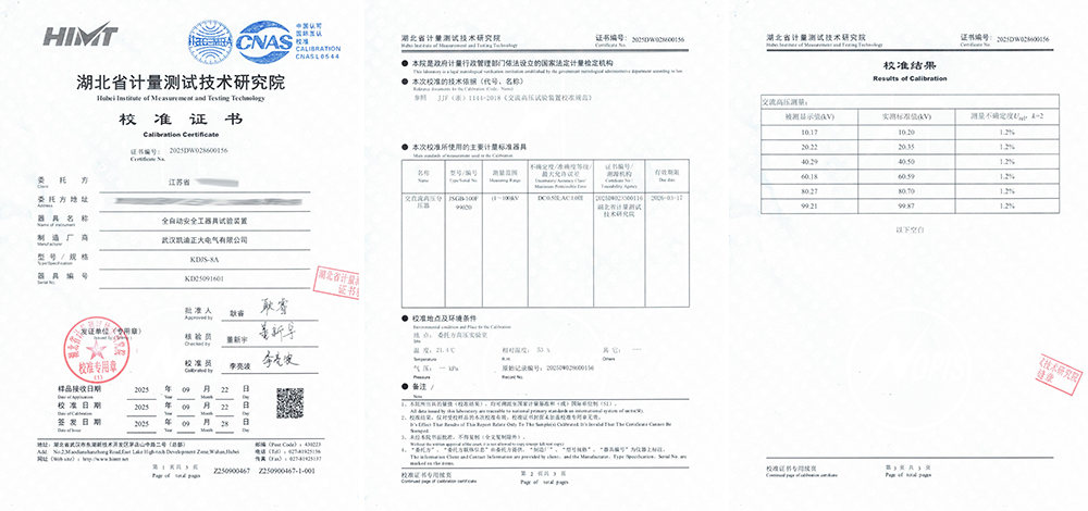 江苏某灌溉单位采购武汉凯迪正大KDJS-8A型全自动安全工器具试验装置,经湖北省计量测试技术研究院严格校准,取得了编号为2025DW028600156的校准证书。