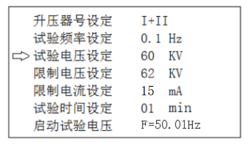 - 升压器号设定:如果使用I号升压器单独升压,升压器号设定为I号(此时试验电压设定≤30KV),如果使用I号升压器和II号升压器串联升压,升压器号设定为I+II号。