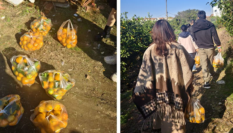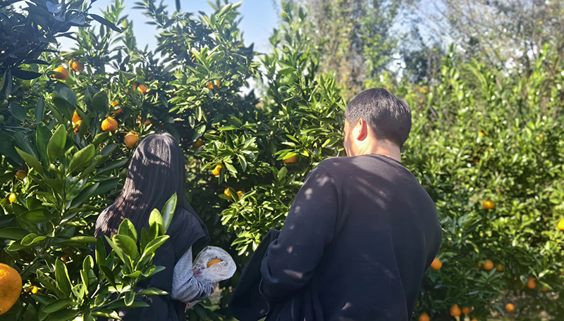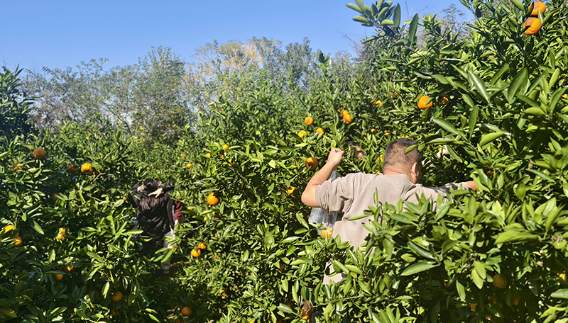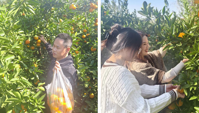 午餐的欢愉余韵未消,大家便迫不及待地提上果篮,奔向那片金色的海洋,真正的“探险”就此开始!步入橘林,漫山遍野的橘树硕果累累,金黄的果子挂满枝头,清新的果香沁人心脾。同事们瞬间化身“探险家”,三五成群,穿梭于果树之间。
