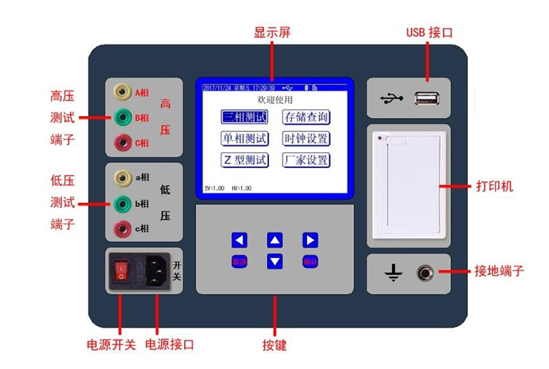 三相变比测试:用于常规三相变压器变比与组别测量。