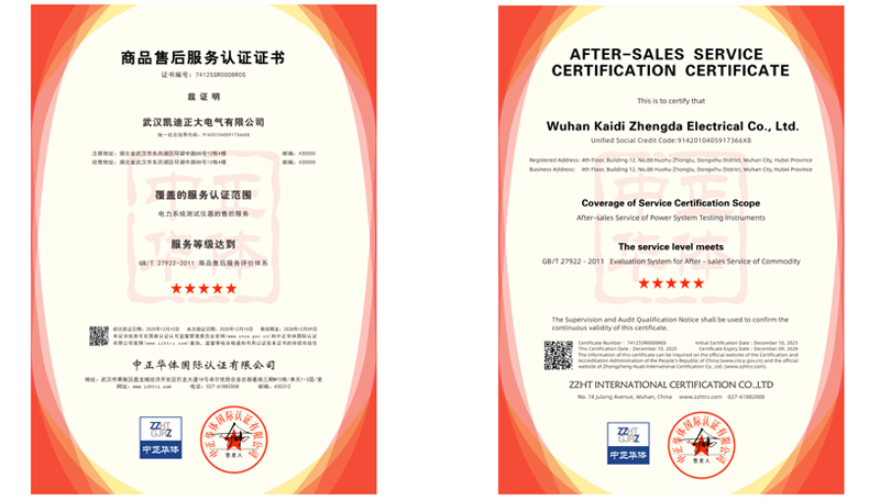 商品售后服务认证针对“电力系统测试仪器的售后服务”,并荣获 五星级 最高评价,这直接证明了公司在售后服务领域拥有规范、高效、客户至上的服务体系,客户满意度和品牌信誉获得了国家级标准的认可。