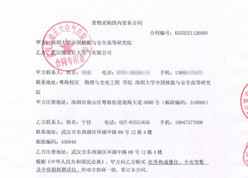近日,深圳大学中国核能与安全高等研究院正式采购了武汉凯迪正大电气有限公司的KDRX-2581红外热成像仪与KDYD-JZ介电常数及介质损耗测试仪,合同编号KDZD25112609N。